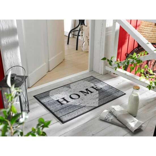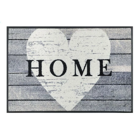 Diese extrem robuste wash+dry Fußmatte präsentiert sich zurückhaltend und unaufdringlich in Grau-Weiß-Schwarz, strahlt aber mit dem klassischen Herzmotiv Wärme und Geborgenheit aus. Der Look alter ‘verwitterter’ Holz-Bohlen machen unsere Türmatte zudem zu einem perfekten Accessoire für den Shabby-, Vintage- oder Maritim-Look. Der Schriftzug ‘Home’ mitten über dem Herz bezeugt: Hier ist der Ort, an dem Sie sich wohlfühlen und an dem Ihr Herz zu Hause ist.