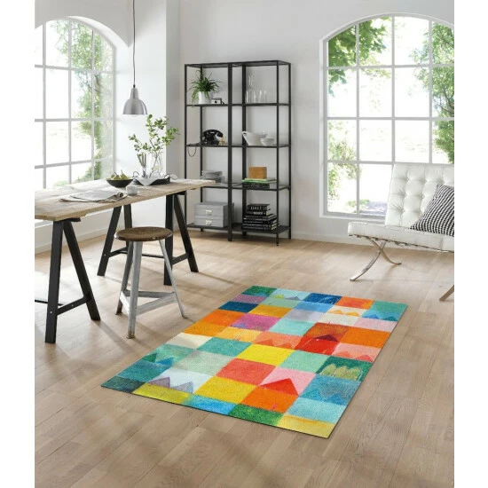 Die Fuß-und Wohnmatte Sonnenstadt aus der neuen wash+dry Decor Kollektion erstrahlt in prächtigen Farben. Da sie keinen sichtbaren Gummirand besitzt, wirkt sie wie ein moderner Designteppich.