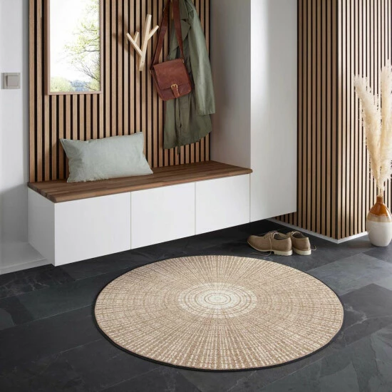 Markanter Blick- & Schmutzfang Kreisrunde “wash + dry”-Fußmatten im Baumstamm-Dessin – Die kreisrunden Qualitätsmatten “Cascara” erinnern optisch an die Jahresringe eines Baumstamms und setzen tolle Akzente. Sie vereinen die hygienischen Eigenschaften einer Fußmatte mit dem optischen Anspruch eines exklusiven Teppichs. Die robuste, nur 0,7 cm flache Matte besteht aus einem dichten Polyamid-Flor, der Schmutz und Feuchtigkeit auch in hoch frequentierten Bereichen optimal aufnimmt. Die überaus strapazierfähigen Matten sind PVC-frei und haben einen rutschhemmenden Nitrilgummirücken. Sie sind zudem besonders pflegeleicht und können ganz unkompliziert bei 60°C in der Maschine gewaschen und getrocknet werden. Für Fußbodenheizung geeignet.